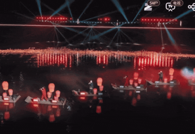 最冷艳的是特色的水上非遗唢呐表演,12位艺人坐正在竹筏上合奏,高亢的唢呐声伴着水景灯光,古韵十脚。
