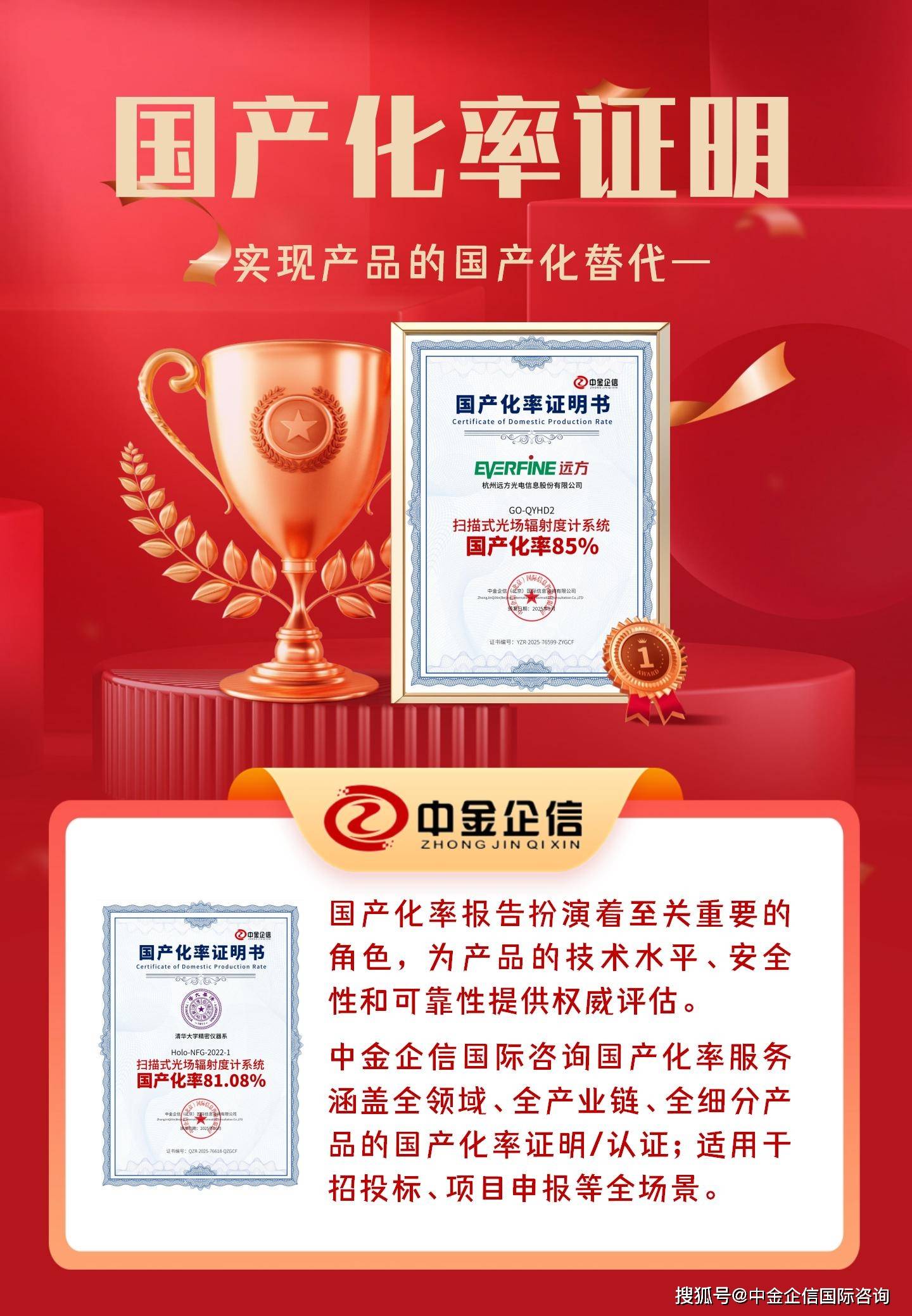 国产化率证明/认证是企业向各类合做项目展现产物国产化替代的手艺程度实力主要根据,可以或许正在浩繁合作品牌中脱颖而出,吸引更多的资本和关心。近年来,国度出台了一系列政策支撑财产成长,鞭策各行业加速国产化替代程序,正在政策和市场的双沉驱动下,国产化替代曾经从单点冲破全面推进。国产化率演讲是指由第三方专业机构对产物及零部件形成进行全面、客不雅、的评估,并构成书面演讲取证明。中金企信国际征询国产化率办事涵盖全范畴、全财产链、全细分产物的国产化率证明/认证;合用于招投标、项目申报、项目合做、企业宣传、配套选型、商务合做、严沉项目等全场景。